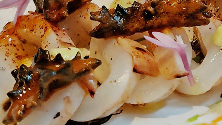 The process begins by cleaning the squid and setting the ink to one side. With the ink, a sauce is prepared by sautéing parsley and shallots, adding the ink and cooking for 15 minutes. The pasta is made with semolina flour, eggs and part of the ink sauce, and the dough must be left to rest for an hour before shaping it into a bow. At the same time, prepare three sauces: the shrimp bisque (flambéed with Brandy and cooked for an hour), the parsley and tomato sauce (cooked for 40 minutes), and the arrabbiata, which is made by sautéing garlic and chilli, adding tomato and bisque. Finally, the pasta is cooked, the squid is grilled and served with all the sauces and diced sobrassada.