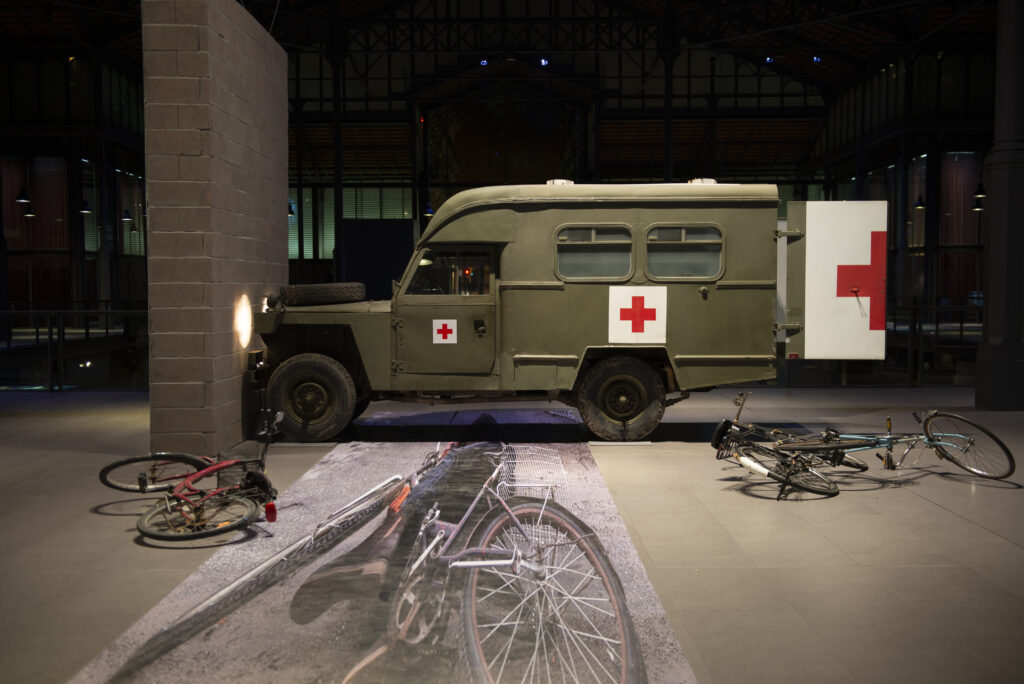 Pensareu en totes aquestes coses veient una obra que té com a centre… un ou o, més concretament, la fragilitat que representa. I és que, ja ho veureu, en aquesta instal·lació, un ou se sosté en un equilibri precari entre una ambulància de guerra i un mur. I si cau? L’ou es troba en un estat fronterer o liminar, en un estat d’equilibri que pot conduir en qualsevol moment a la seva destrucció… o potser no. És una al·lusió al caràcter precari i fràgil de la pau en els moments previs a l’inici d’un conflicte.