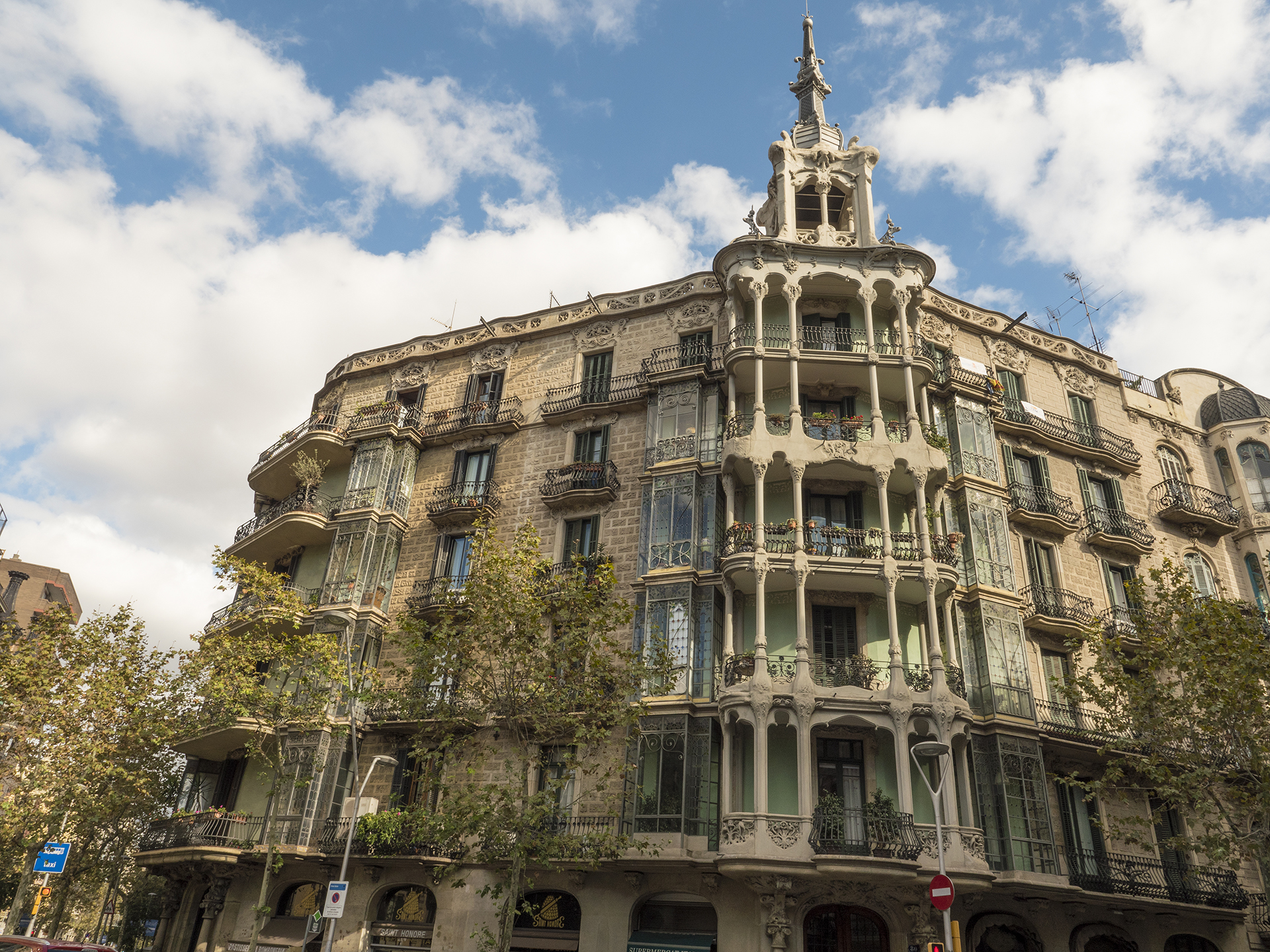 L’element més característic de la construcció són les dues cases adossades en xamfrà i l’elegant tribuna d’una de les cantonades, feta de pedra de forma oberta i coronada per una de les cúpules més impressionants de l’Eixample. En el projecte inicial aquesta tribuna tenia una rèplica a l’altra cantonada, però dissortadament es va perdre en una reforma posterior.