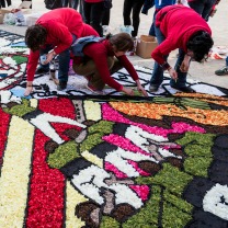 Catifes de flors, flower carpets, are ephemeral artworks traditionally made out of petals, whole flowers and herbs, although for some years now their makers, catifaires, have experimented with other materials, such as seeds, sawdust and coffee grounds. They represent many kinds of things but generally they are linked to the religious side of Corpus Christi, spring, local themes or just geometric patterns.