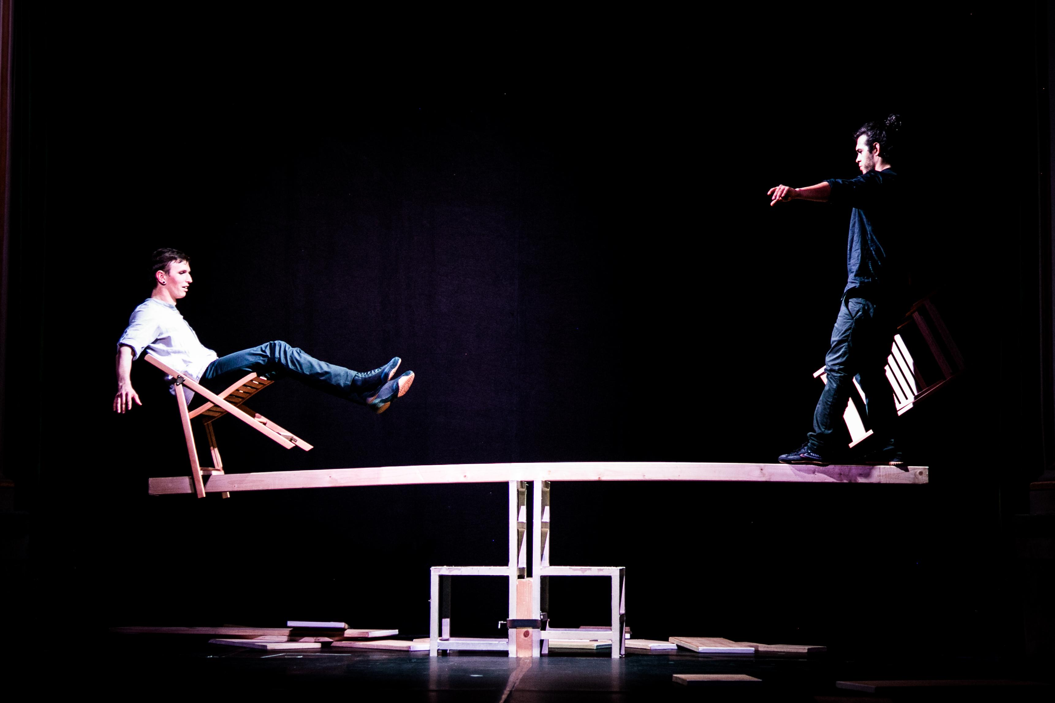 David Diez Méndez y Tomas Václavek son dos artistas multidisciplinares de circo, especializados en la búsqueda del equilibrio y la manipulación, utilizando siempre objetos cotidianos. Aman lo que hacen, y eso se percibe desde el momento en que salen a escena con la idea de llevar a cabo uno de sus juegos locos y peligrosos en los que ponen a prueba constantemente el coraje y la confianza ciega que tienen entre ellos.
