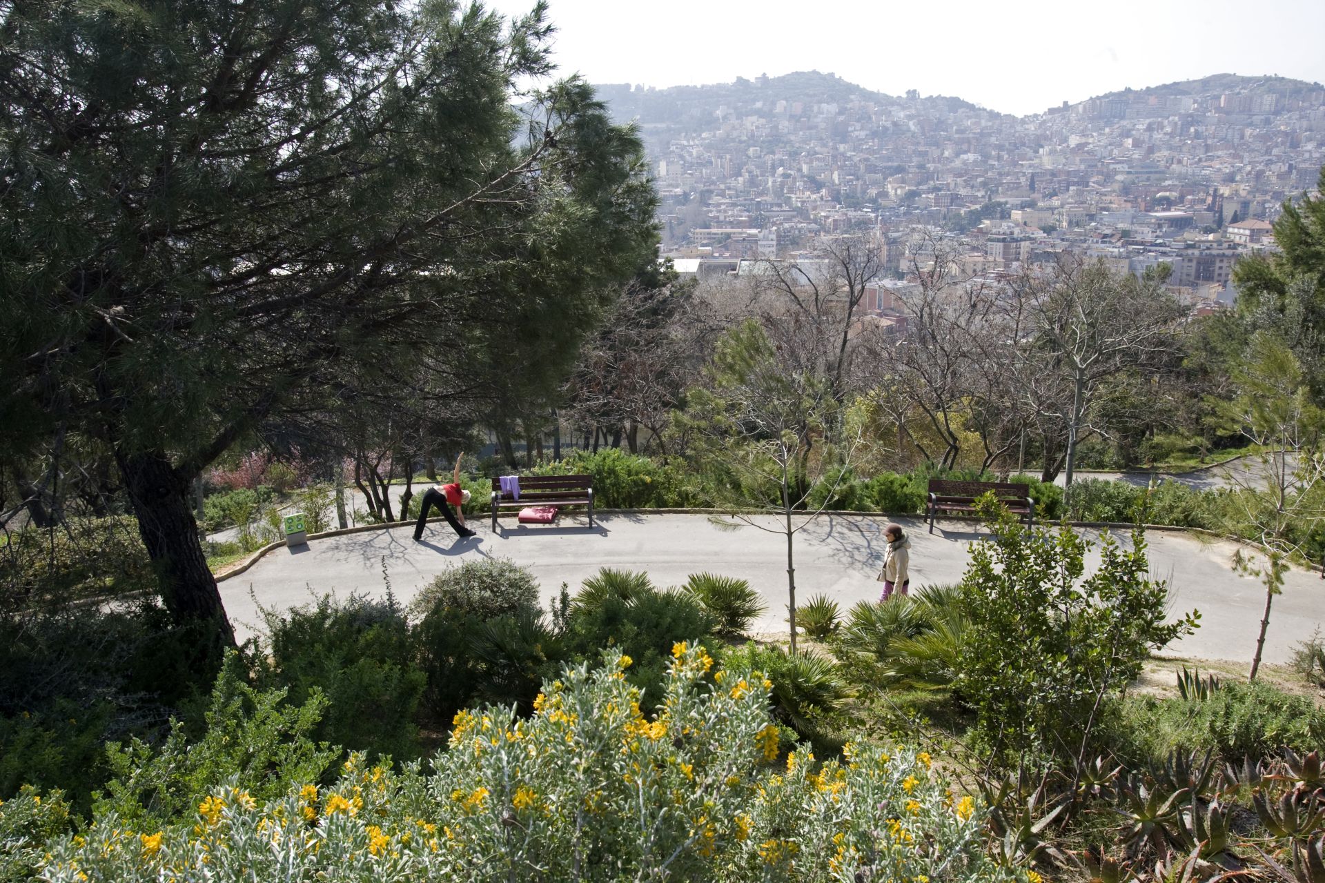 The park winds its way up the hill it is named after in a spiral of circular paths that take you to the top. There are also stone steps that let you climb there in a straight line. Along the way are resting places, with benches, platforms, children’s playgrounds and picnic areas. The scenery gradually changes as the lower part, predominantly landscaped and grassy, gives ways to the leafy pine grove higher up.