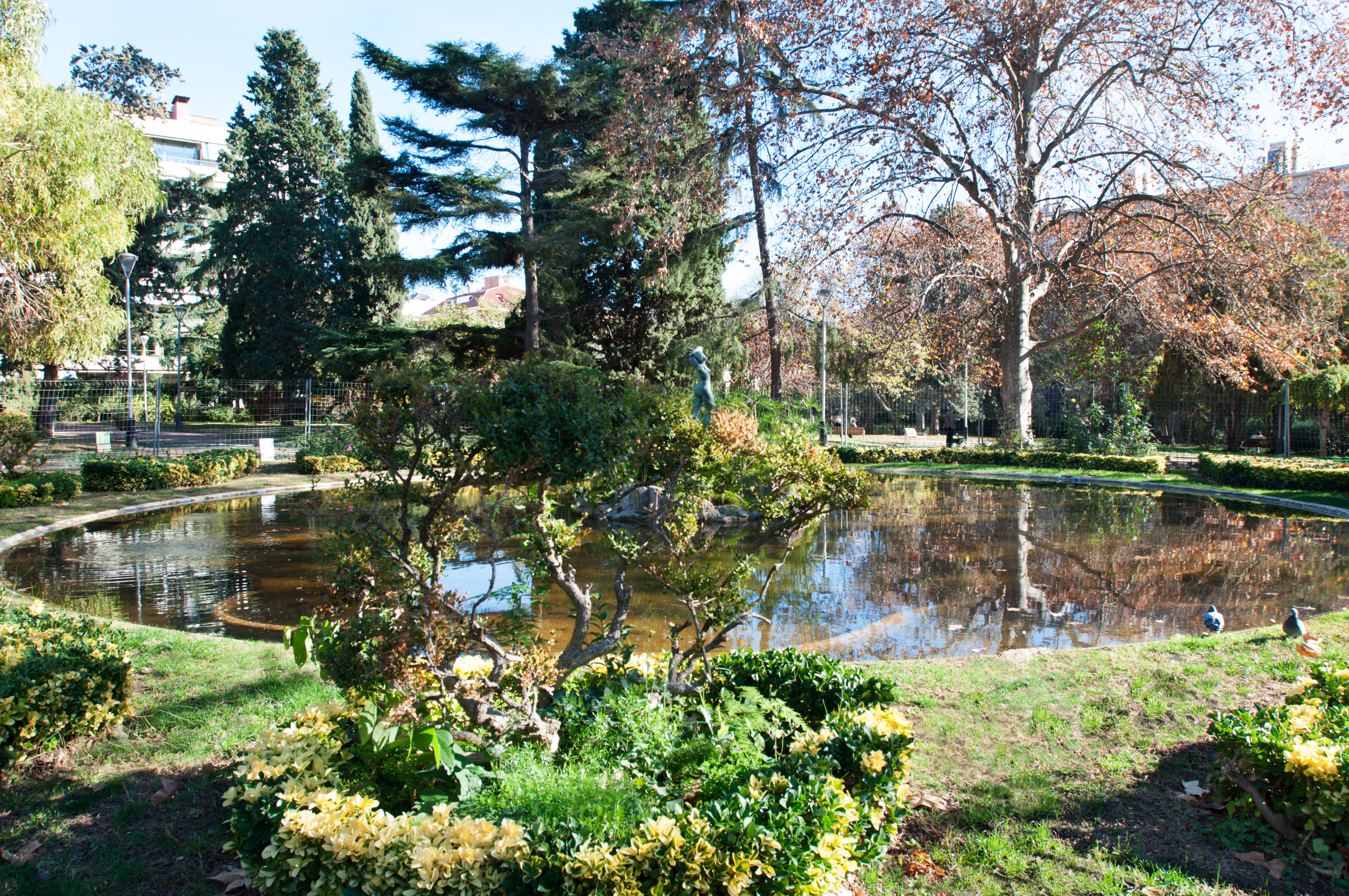 Around fifty plant species grow in the gardens, but the ones that attract most attention are the trees listed in Barcelona’s Trees of Local Interest Catalogue, including a plane tree that is nearly 90 years old. There is a bronze figure of a Dryad, or tree nymph, in the middle of a pond. It is considered to be one of Ricard Sala’s finest sculptures. And nearby, there is an ephebe playing the flute, the Encantador de serps (Snake Charmer), a bronze sculpture by the Belgian artist Jules Anthone.