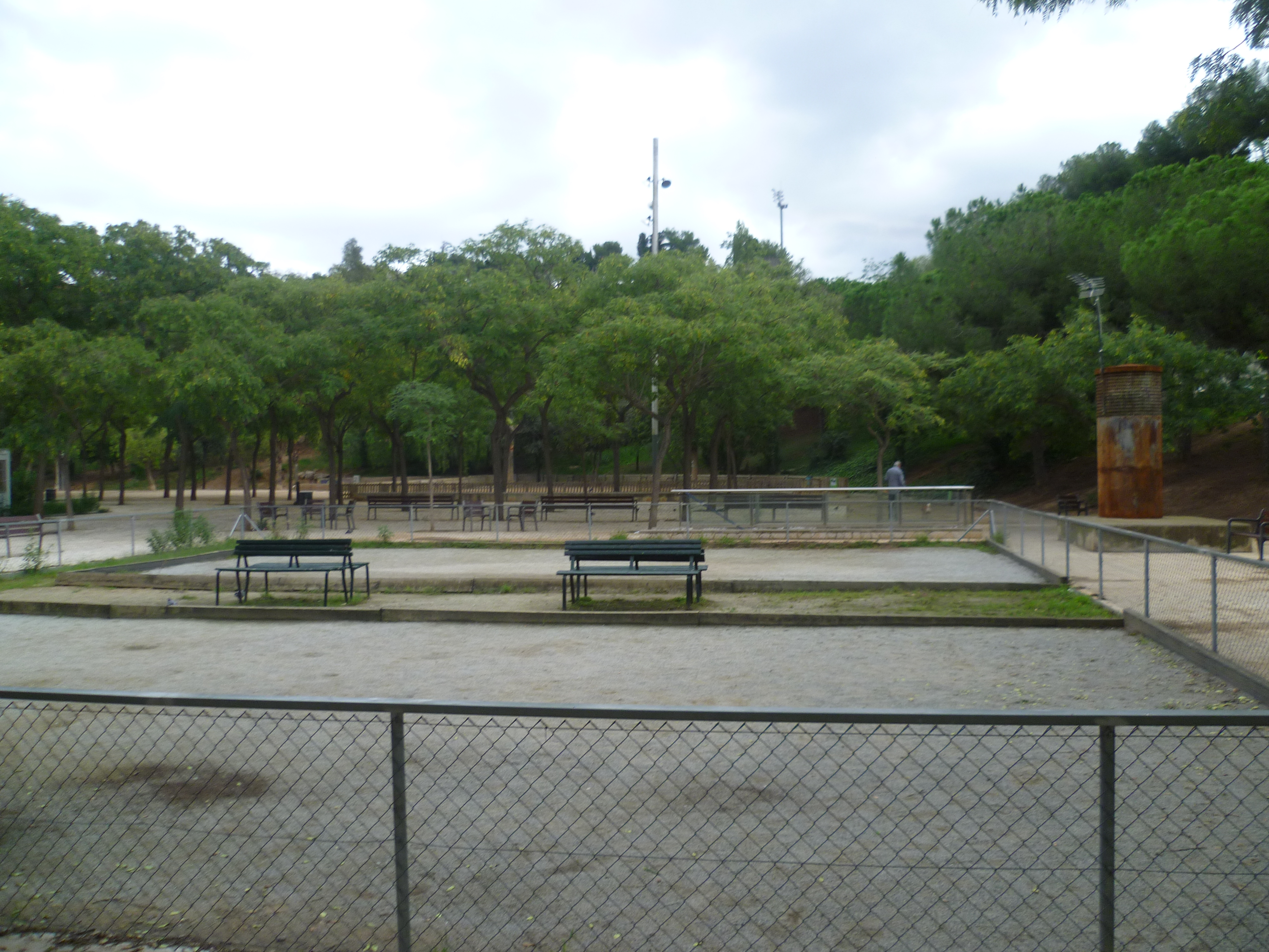 Si se accede al parque desde la plaza de las Matemàtiques, lo primero que se encuentra es un espacio dedicado a las pistas de petanca, muy frecuentadas tanto por los jugadores como por los que se divierten desde los bancos que las rodean. La otra entrada, a la altura de la Gran Via de les Corts Catalanes, lleva al visitante por un camino que comunica el parque con la calle de la Font Florida. El paseo queda por encima del talud que, recuperando el perfil de la montaña, queda cubierto de césped, pinos, encinas, chopos, ombús y eucaliptos. Por debajo, crecen arbustos mediterráneos como la retama y el espliego. En lo alto, frondosas jacarandas ornamentan la zona. En la plaza central, las protagonistas son las tipuanas, que echan una flor amarilla espectacular.