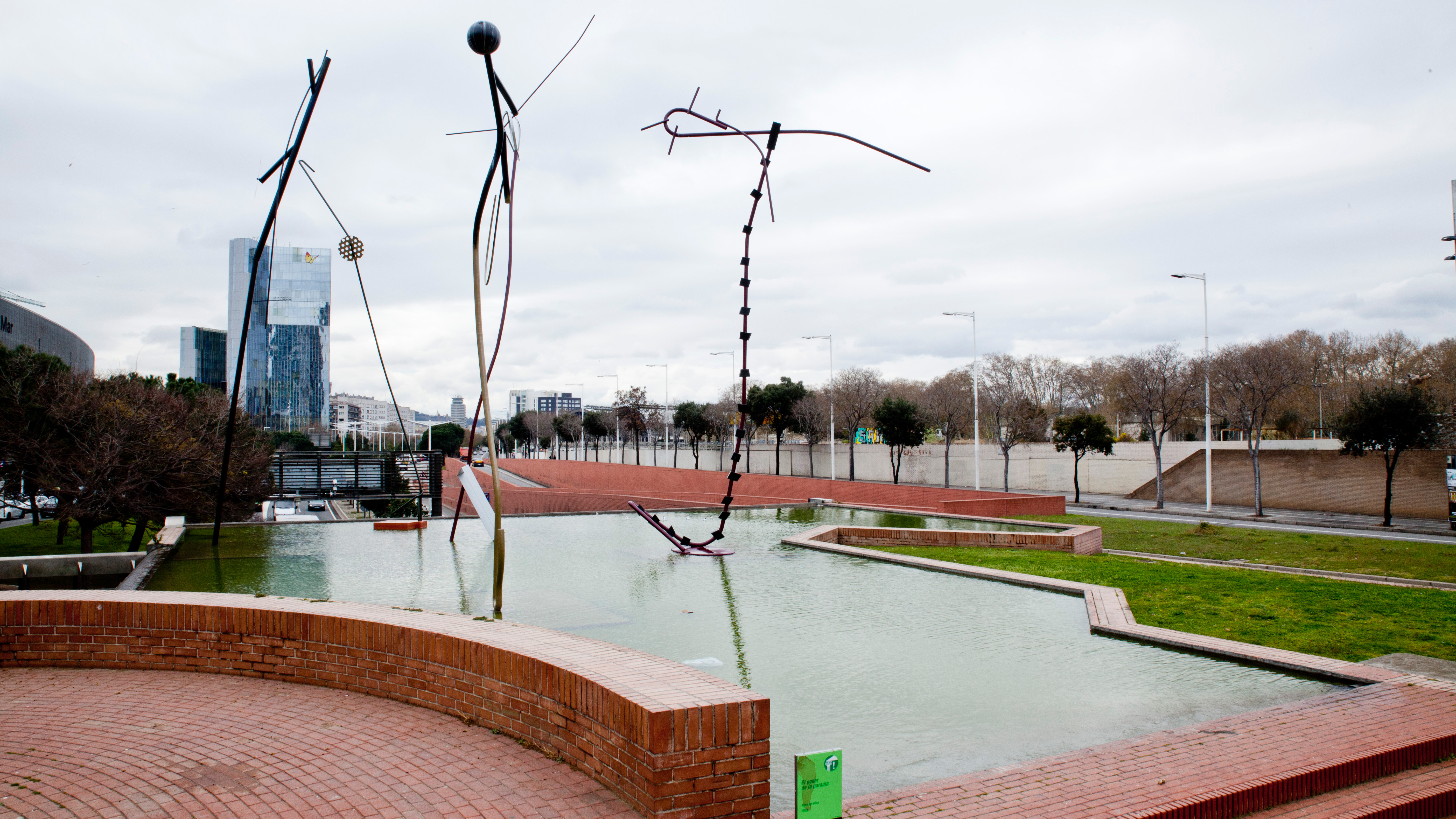Entre las reformas urbanísticas que se hicieron en Barcelona con motivo de los Juegos Olímpicos destacan cinco grandes parques ganados a la ciudad. El de las Cascades, que pasa por encima de uno de los tramos de la ronda del Litoral, es uno. Incluye un estanque que vierte una pequeña cascada. Del interior nace una escultura abstracta, enorme, obra del holandés Auke de Vries y que se titula El poder de la palabra; fue un regalo del Gobierno de Holanda a la ciudad con motivo de los Juegos Olímpicos. No es la única escultura del parque: al otro lado se levanta la gigantesca escultura de Antoni Llena, David y Goliat, que parece suspendida en el aire.