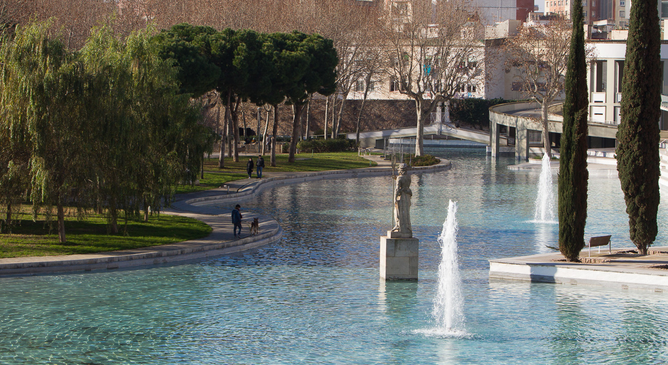 Se extiende por una amplia explanada situada bajo un desnivel cubierto de largas hileras de peldaños. Los que hay al lado de la plaza de los Països Catalans desaparecen en el estanque que bordea casi la mitad de este espacio verde.
