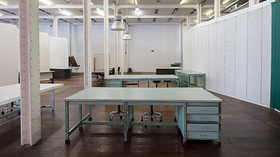 Tallers tancats amb separadors de lona i mobiliari bàsic (cadires, taula i prestatgeria). Amb llum de fluorescent. Aptes per a projectes d’arts visuals i multimèdia.