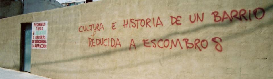 Among the visual documentation of the Cabanyal Archive, there is a photograph of a concrete wall bordering a plot of land on which is painted “Culture and history of a neighbourhood reduced to rubble”. The title of this talk Before the desertion, this was a neighbourhood, shares the same resonance and was taken from a piece of graffiti that could be read, last year, on a boarded-up door of the old Mesón Poble Nou.