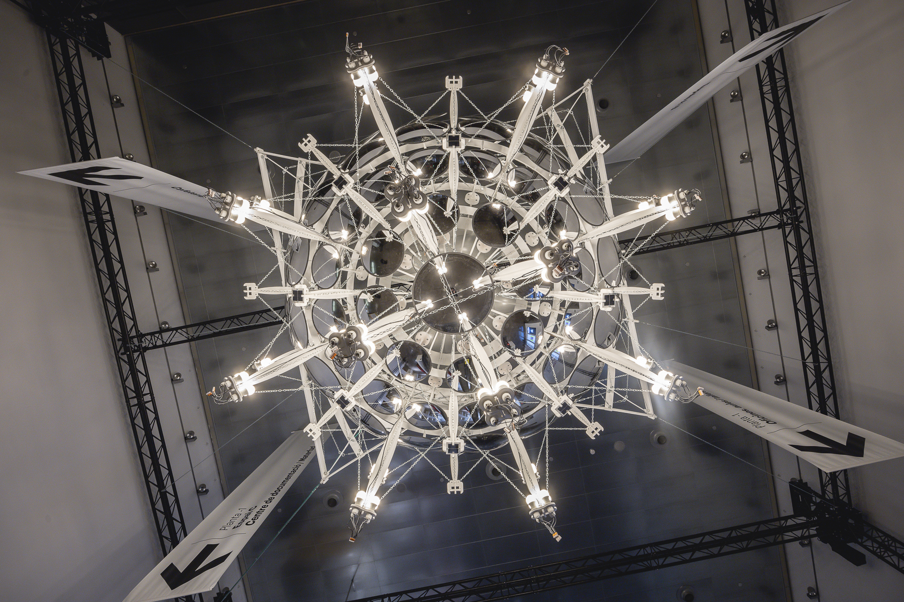 Del sostre del vestíbul del DHub penja “Espill: un satèl·lit per al solstici”, una reproducció a mida real d’un satèl·lit de 180 quilos i 5 metres de diàmetre. És una esfera recoberta parcialment per miralls per oferir a la humanitat un estel de Betlem permanent i sostenible, visible de nit des de diversos punts del planeta. La intervenció especulativa de l’estudi d’arquitectura TAKK, comissariada pel director artístic del DHub, José Luis de Vicente, vol ser una reflexió crítica sobre la contaminació lumínica derivada de l’esclat de la il·luminació ornamental nadalenca o la presència creixent al cel de punts lluminosos que corresponen a objectes d’origen humà. A més de l’artefacte —que és, alhora, màgic, metafòric i altament tecnològic—, el projecte també inclou el relat sobre com s’enviaria el satèl·lit a l’espai, com es veuria des de la superfície de la Terra o com orbitaria al seu voltant. Espill és una proposta tècnicament factible que vol formular una pregunta: qui té dret a posar una llum al cel?