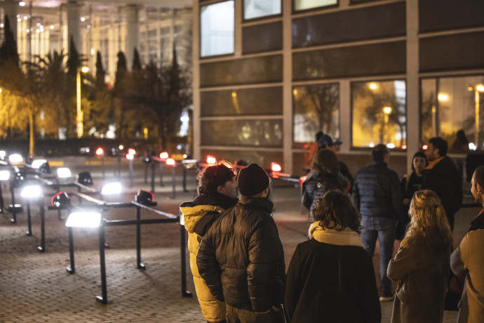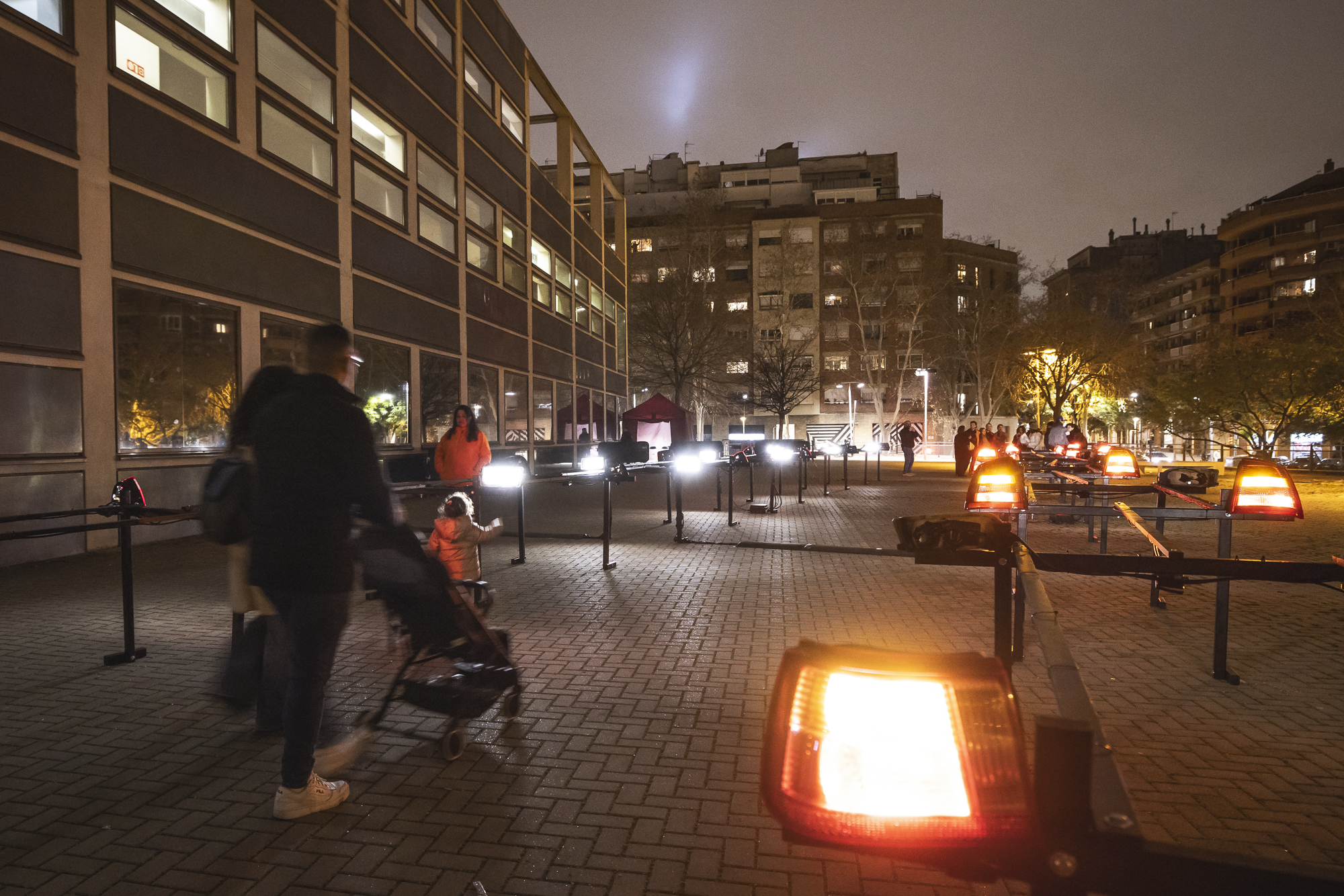 Located in the gardens behind L’Auditori, the installation consists of a series of light structures that evoke car shapes. Using alternating red and white lights, it simulates the chaos of urban traffic, generating an immersive and reflexive ambience. The movement of lights not only represents the saturation of transport but also invites spectators to reflect on the need to tackle the factors that contribute to pollution right across the board, including visible and invisible factors alike.