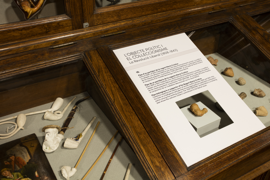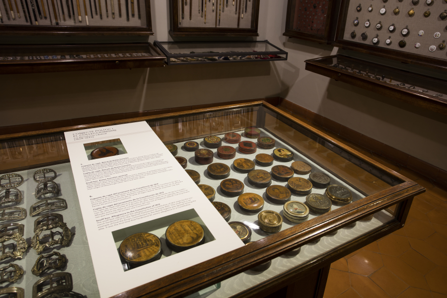 Així mateix, el recorregut mostra quatre tipologies d’objectes ben definides: Objectes associats a formes de consum de les elits de finals del segle XVIII (capsetes de rapè), la politització d’armes i la laïcització de pràctiques religioses com ara les relíquies (floc de cabells); Objectes i accessoris masculins vinculats al consum de tabac (pipes, cigarreres, paper de fumar) i alcohol (elixir), i a la pràctica del joc (cartes); Noves formes de reproducció massiva d’imatges (gravats, litografies i fotografies) que es poden combinar amb d’altres objectes, com ara accessoris (ventalls); i formes de pedagogia eclesiàstica que es van secularitzar per construir narratives de vides d’herois romàntics o històries nacionals (auques).