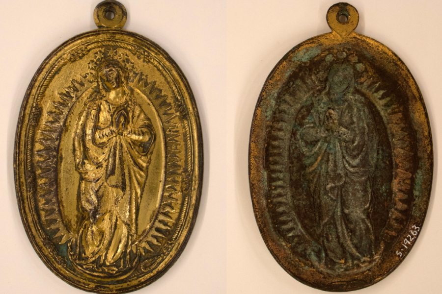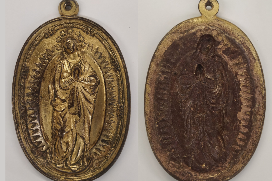 S’ha intervingut en 19 plaques religioses i una aiguabeneitera de la Sala de la fe, així com una pinta de la Sala femenina. Les plaques, de coure daurat i amb representacions religioses, preferentment dels segles XVI al XVIII, formen part d’un conjunt de gairebé quaranta peces ubicades en una mateixa vitrina. Aquest grup presentava restes de cera, restes de productes de neteja i corrosió. L’aiguabeneitera de coure també presentava corrosió i la pinta, de metall i carei, sulfuració.