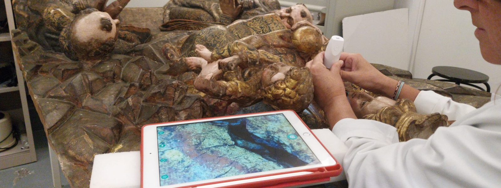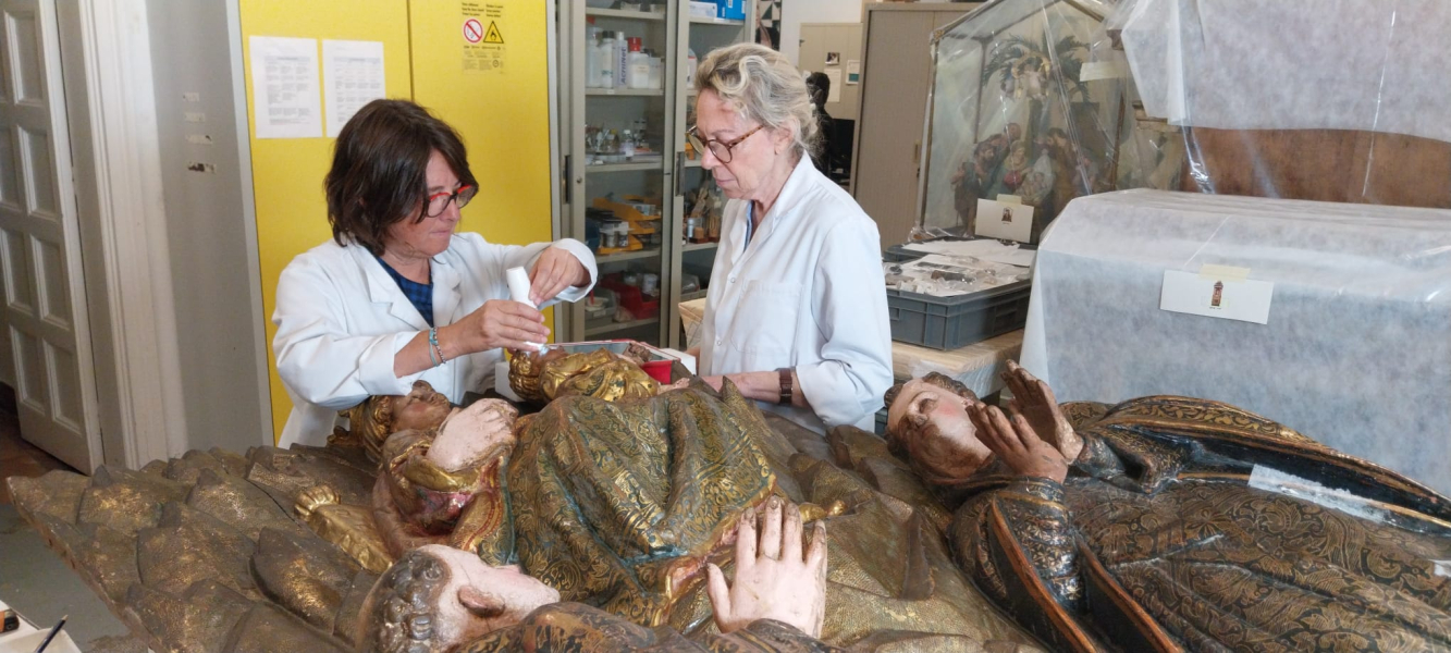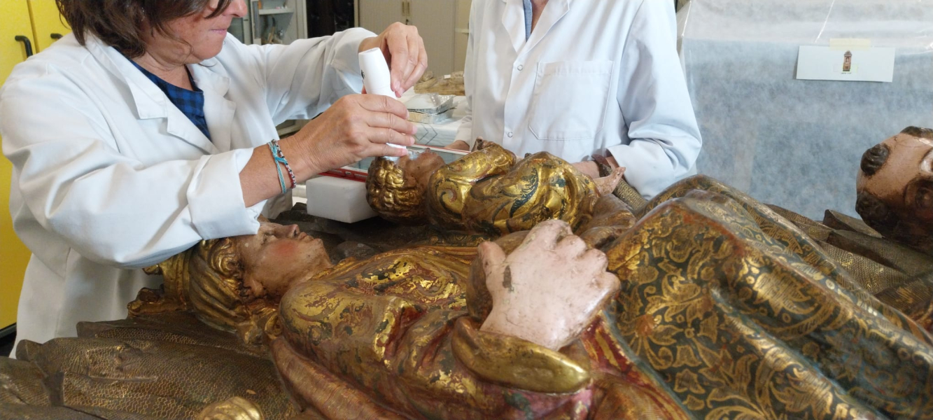 The conservation-restoration interventions have been carried out to a total of nineteen pieces , which have been grouped according to the material and techniques of execution, among which are three in polychrome wood and one in polychrome paste on wood, nine pieces of graphic work on paper in different techniques and formats -photomontage, engravings and printed paper, among others-, five pieces of goldsmithery and the metal appliques of a piece of furniture.