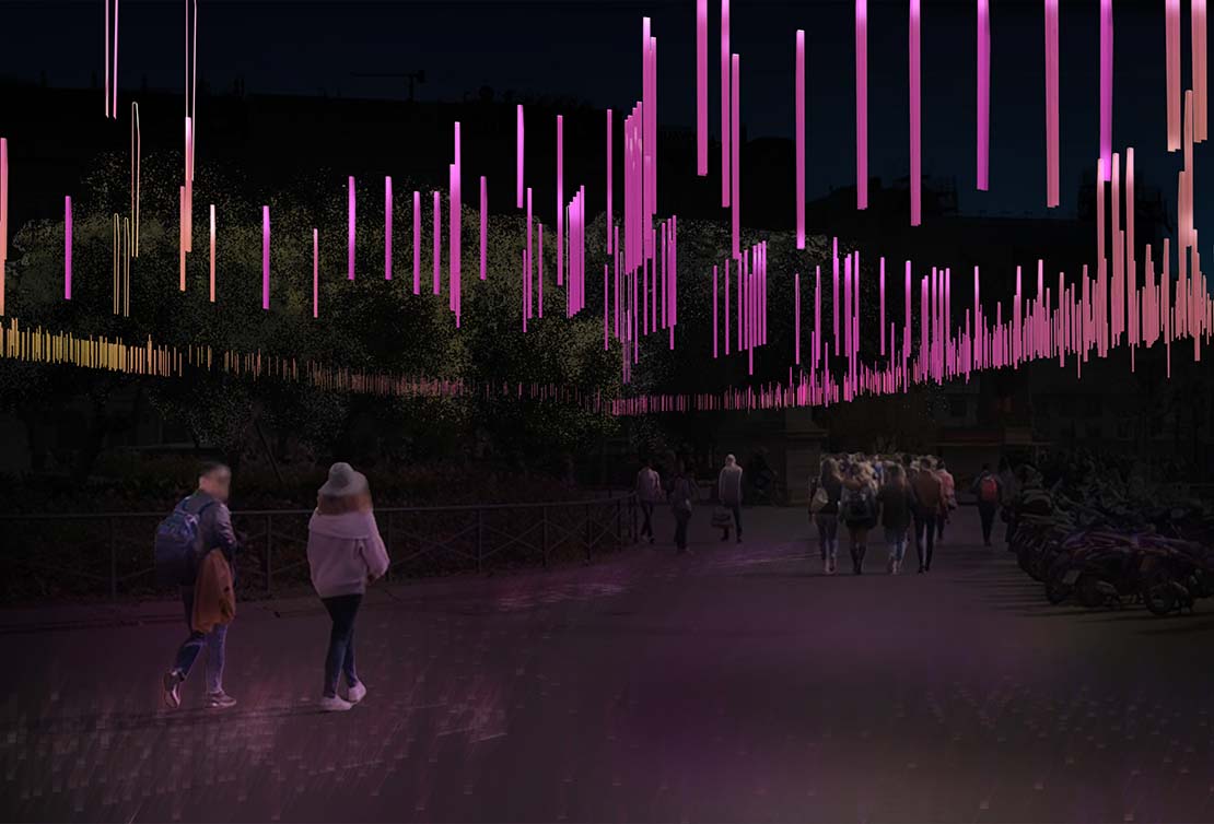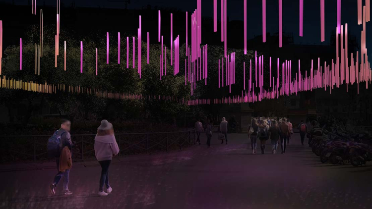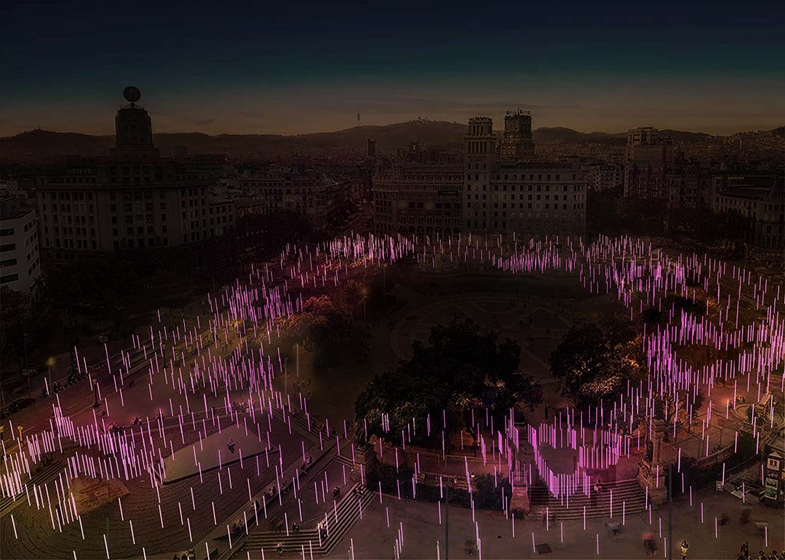 El projecte El cor de la ciutat a la plaça Catalunya proposa una instal·lació lumínica poètica i immersiva inspirada en els ocells que habiten a la plaça, símbols icònics de la ciutat. A través d’una coreografia de llums que simula el vol dels ocells formant cors en l’aire, es transmet un missatge d’amor i connexió emocional durant les festes nadalenques. Aquesta intervenció transforma l’espai en una experiència visual tant de dia, amb reflexos dicroics naturals, com de nit, mitjançant tecnologia led eficient.