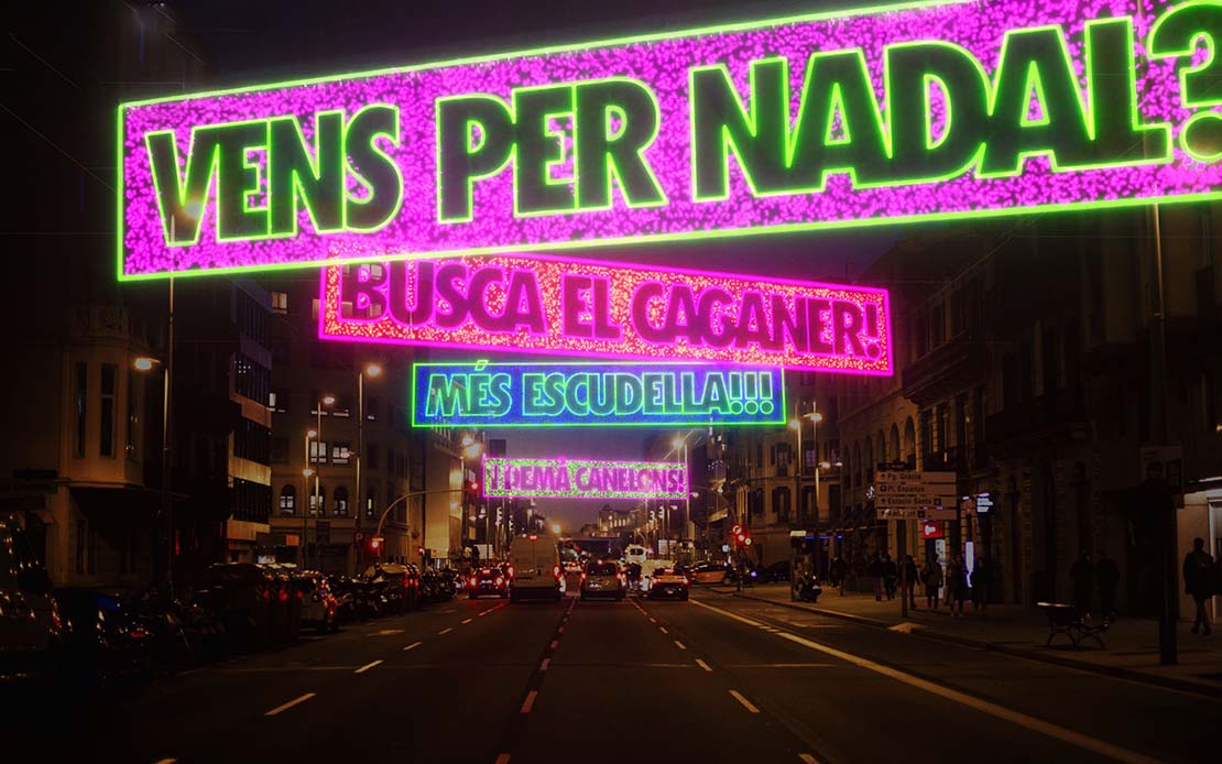 El Nadal a casa omple el carrer d’Aragó del caliu de l’interior de les cases a través de l’humor i les frases quotidianes. Els missatges connecten tant amb adults com amb infants i evoquen escenes típiques dels àpats i moments en família, però allunyant-se de les frases nadalenques convencionals que solem trobar arreu durant aquestes dates. Aquesta proposta vol connectar emocionalment amb veïns i visitants i recuperar la tradició oral de Nadal des d’una mirada contemporània i accessible.